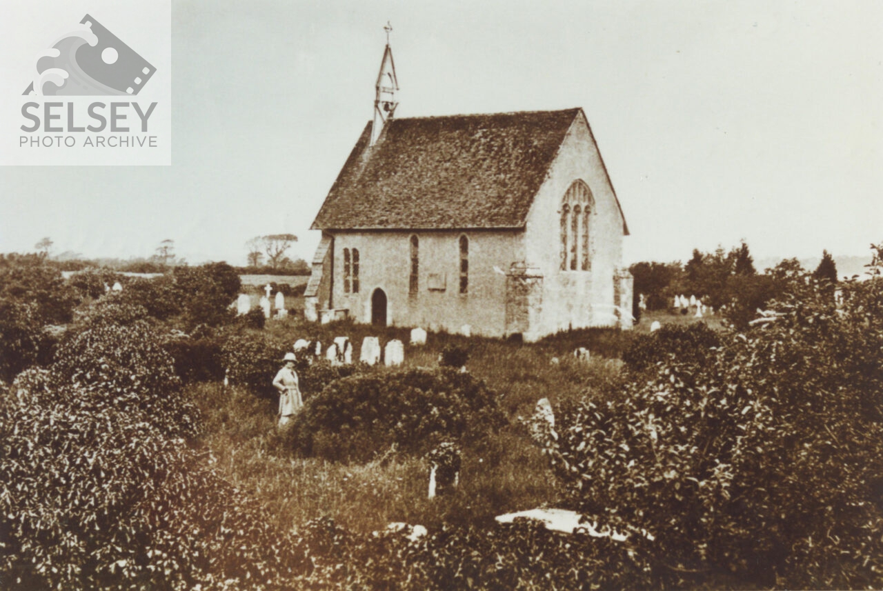 Set 138. Postcard of ‘The Old Church, Selsey on Sea’ showing the chapel and overgrown grave yard, with woman among bushes.