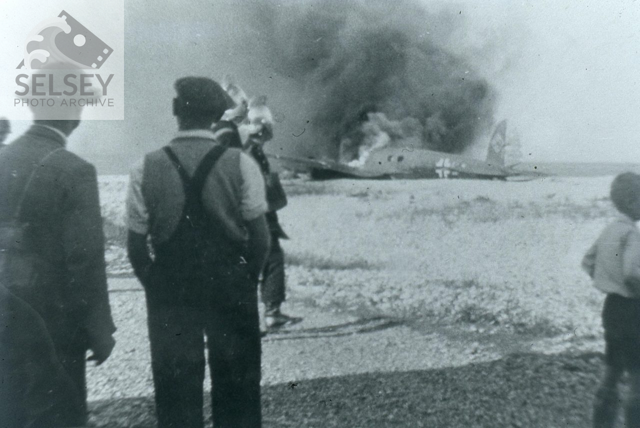 The Heinkel He 111H was shot down while attacking Portsmouth Dockyard. It made a forced landing on the beach near Park Copse at 6-15pm. Three Germans were captured and two died and are buried at St Andrew’s Tangmere. A member of the Home Guard, two firemen, a police officer, a man and boy look on.