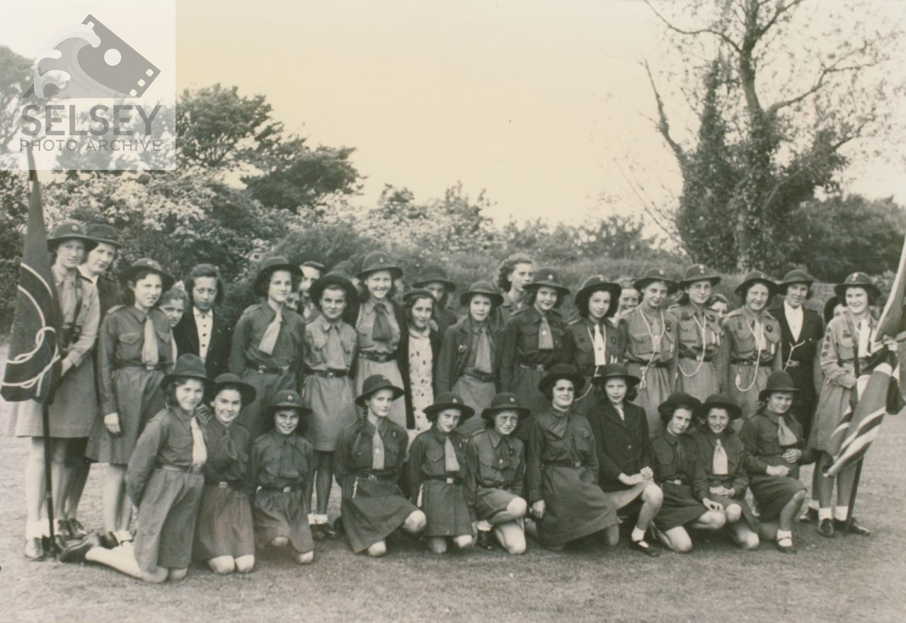 | Girl Guide Troupe with flags in the grounds of St Peter’s Church on V.E. Day. |