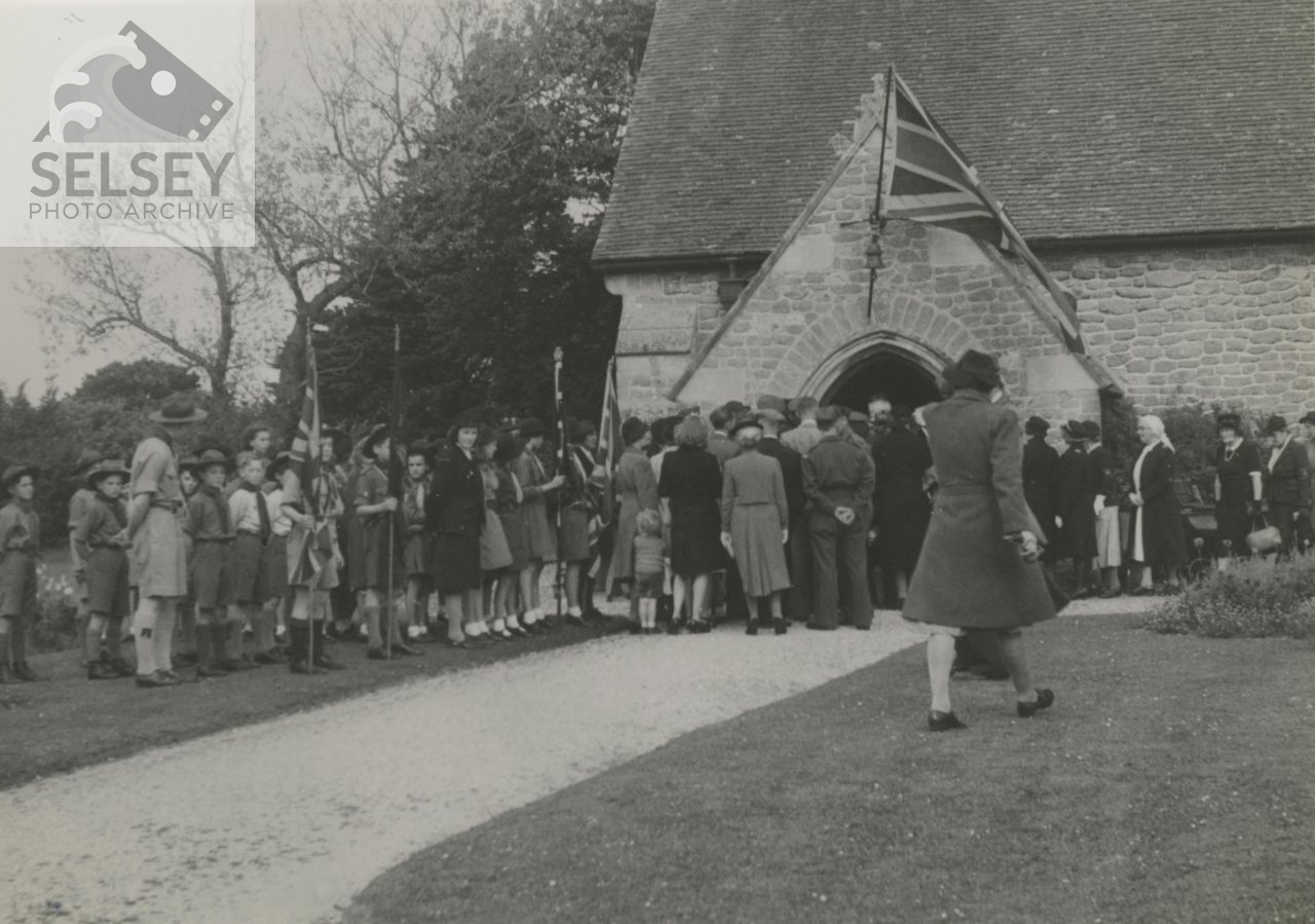 People line up outside the church for a service to mark Victory in Europe. Guides, Brownies and Scouts form an escort guard.