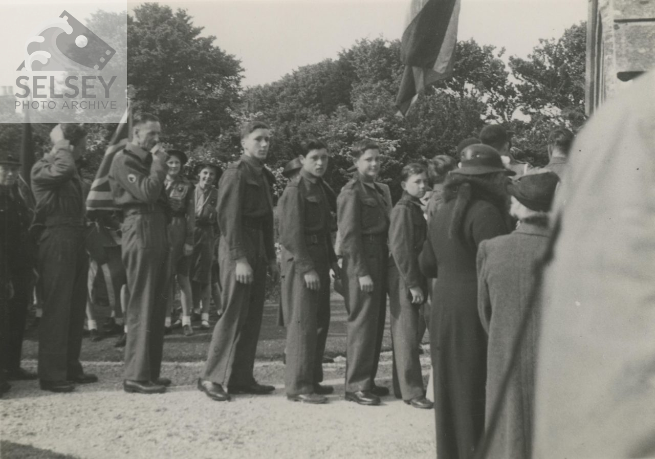 Army Cadets waiting in line with other people outside St Peter’s Church on V E Day .