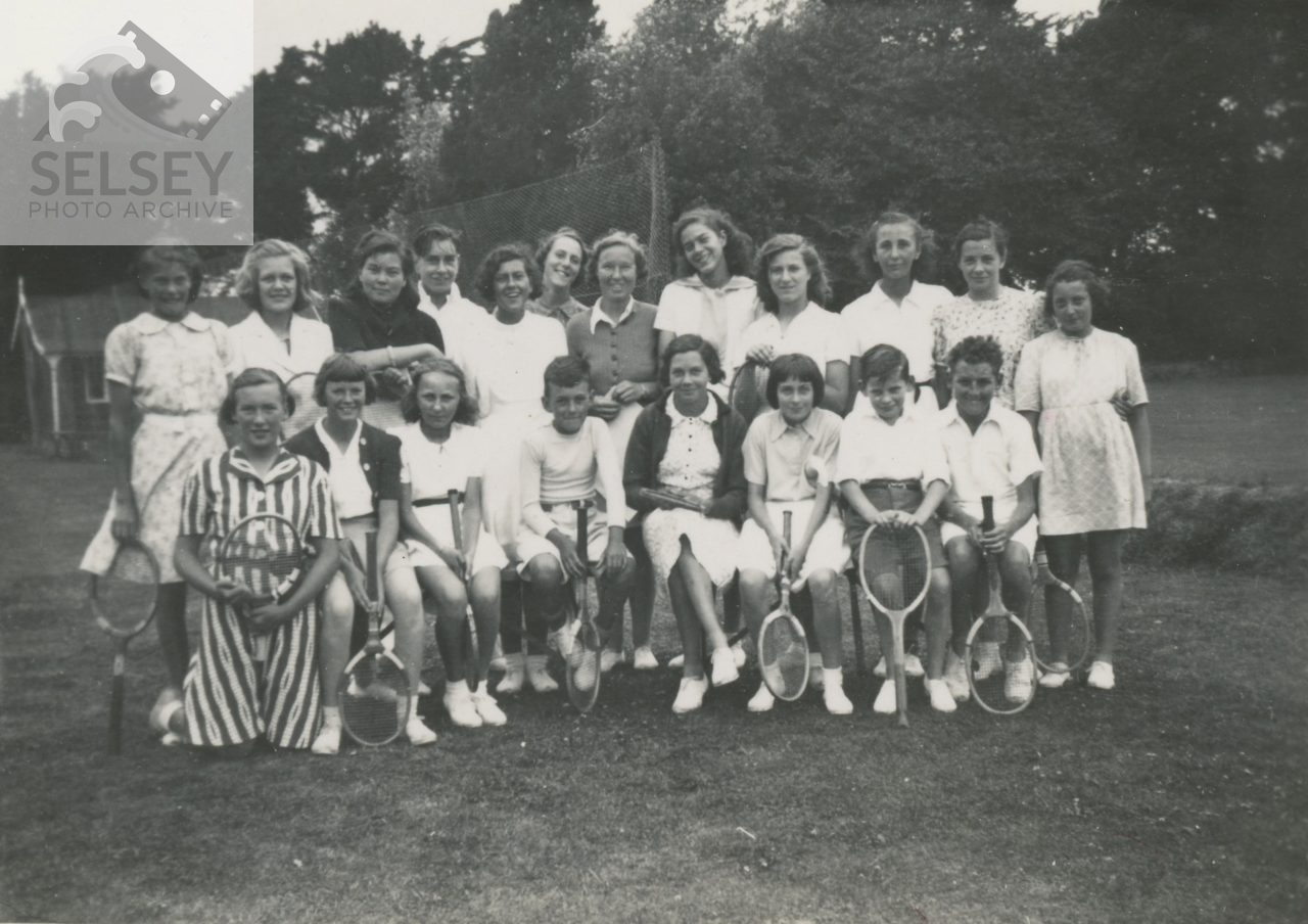 | Competitors at the Crablands Junior Tennis Tournament and some adults in the background, including Joyce Gardner. |
