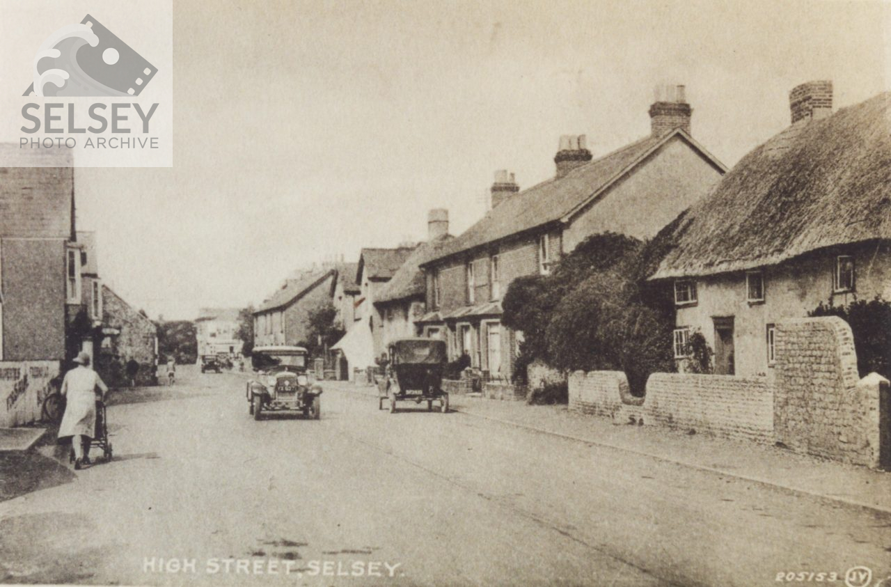 Set 137. Copy of a postcard of the High Street (JV205153 registered 1928), shows cars in the road and a woman pushing a pram. The thatched cottage on right of photo, was demolished and has been replaced by 3 shops, where the zebra crossing is now.